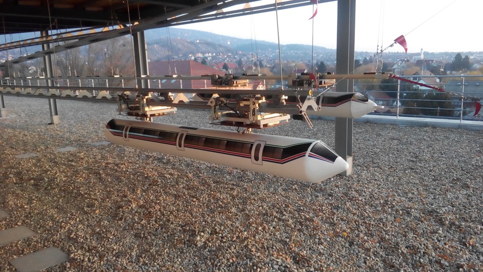 Suspended battery powered electric railway model with 4 driven axis